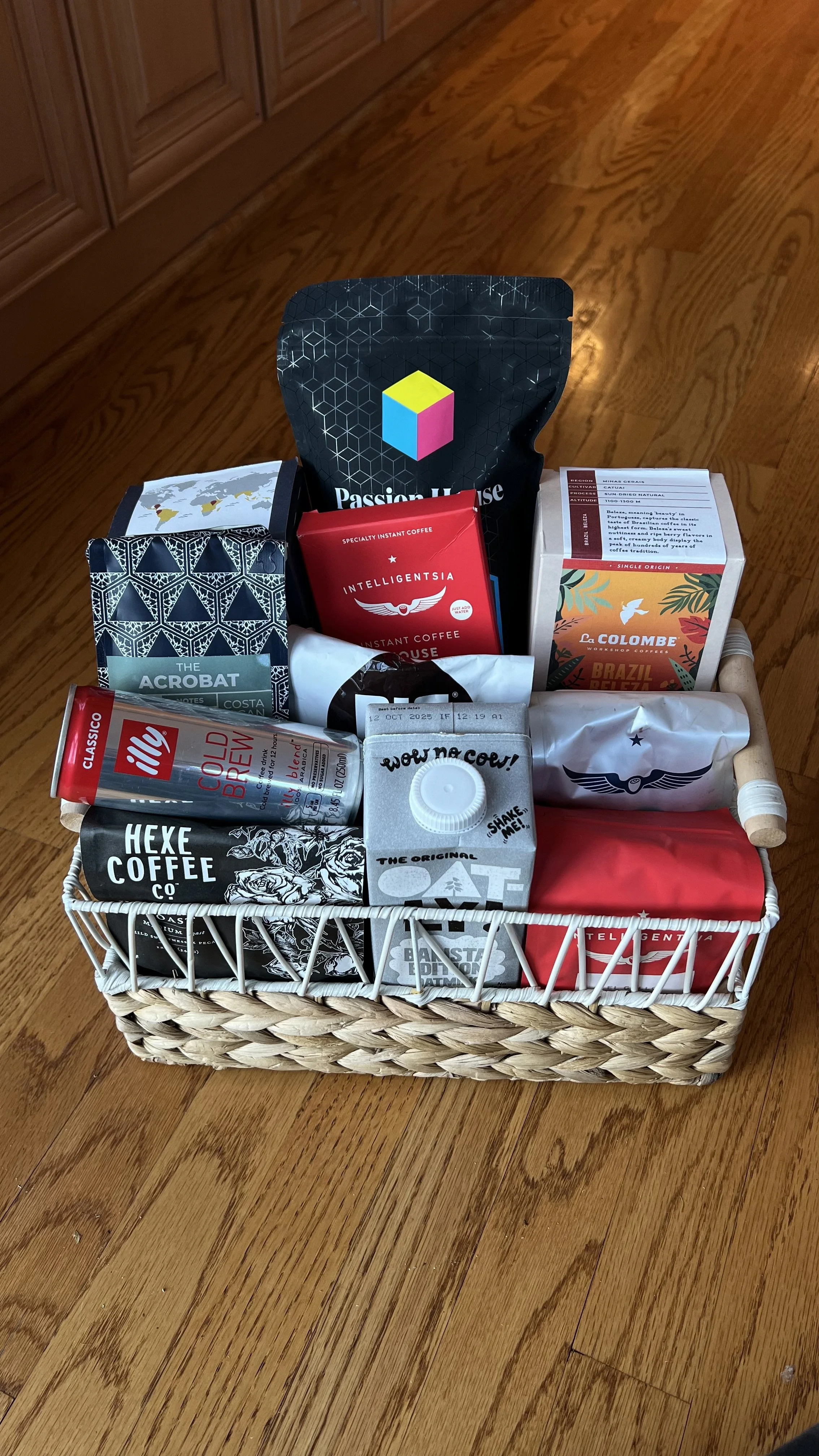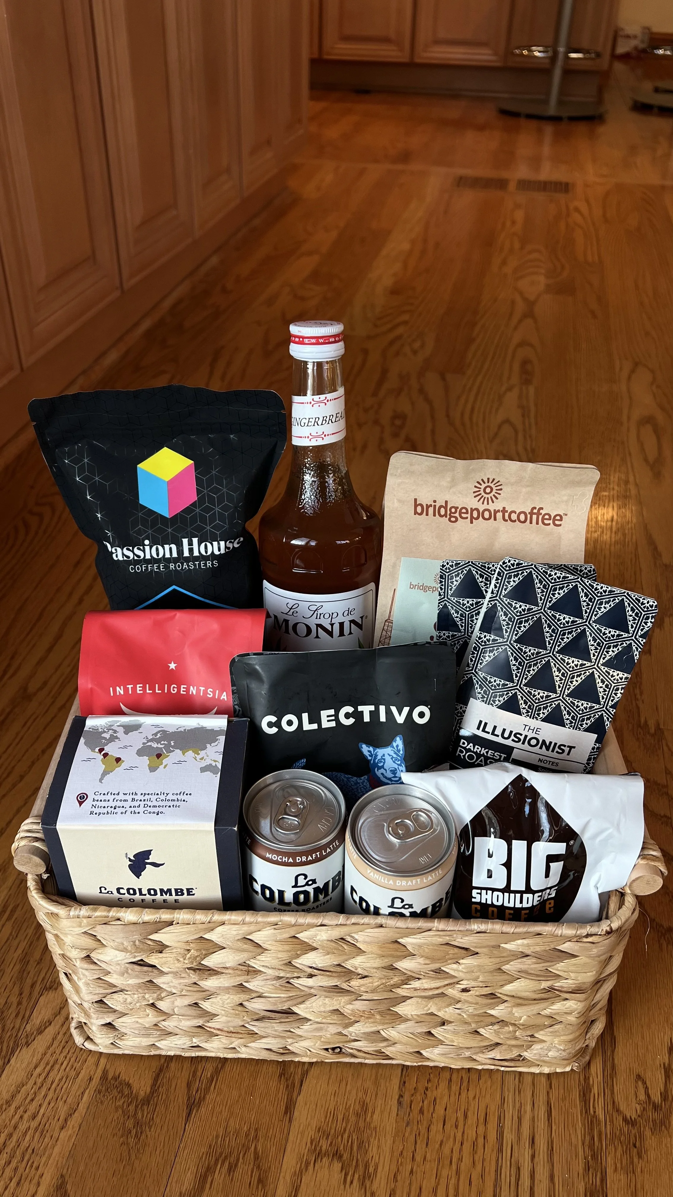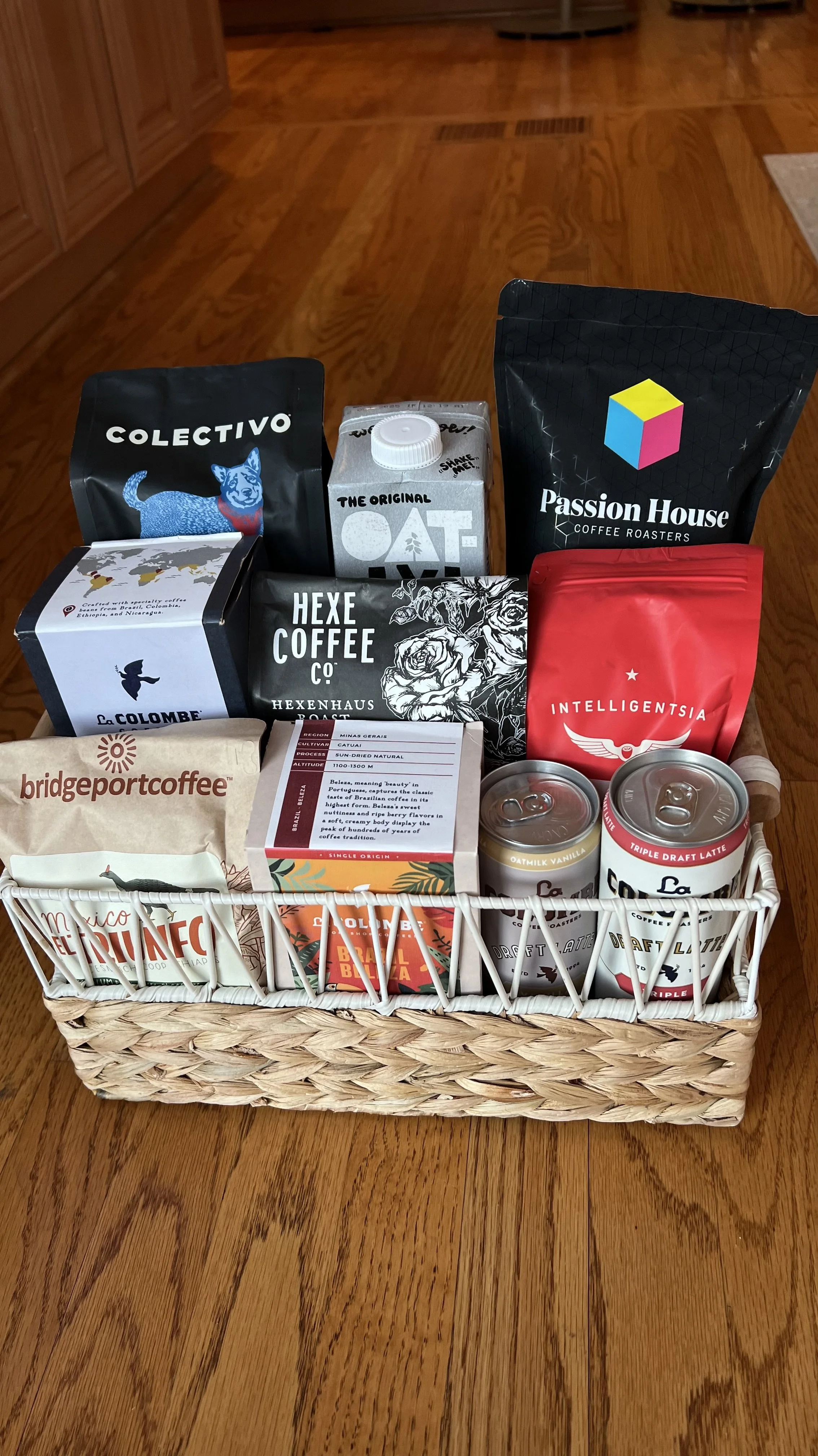 Each basket contains over 7 different bags of coffee beans from local roasters and other fun coffee items.